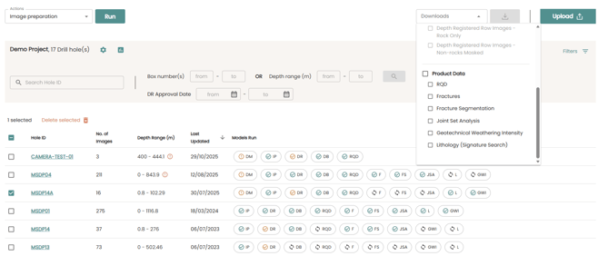 Once the hole is successfully completed the results can be downloaded by selecting your holes and selecting the product from the Downloads dropdown menu